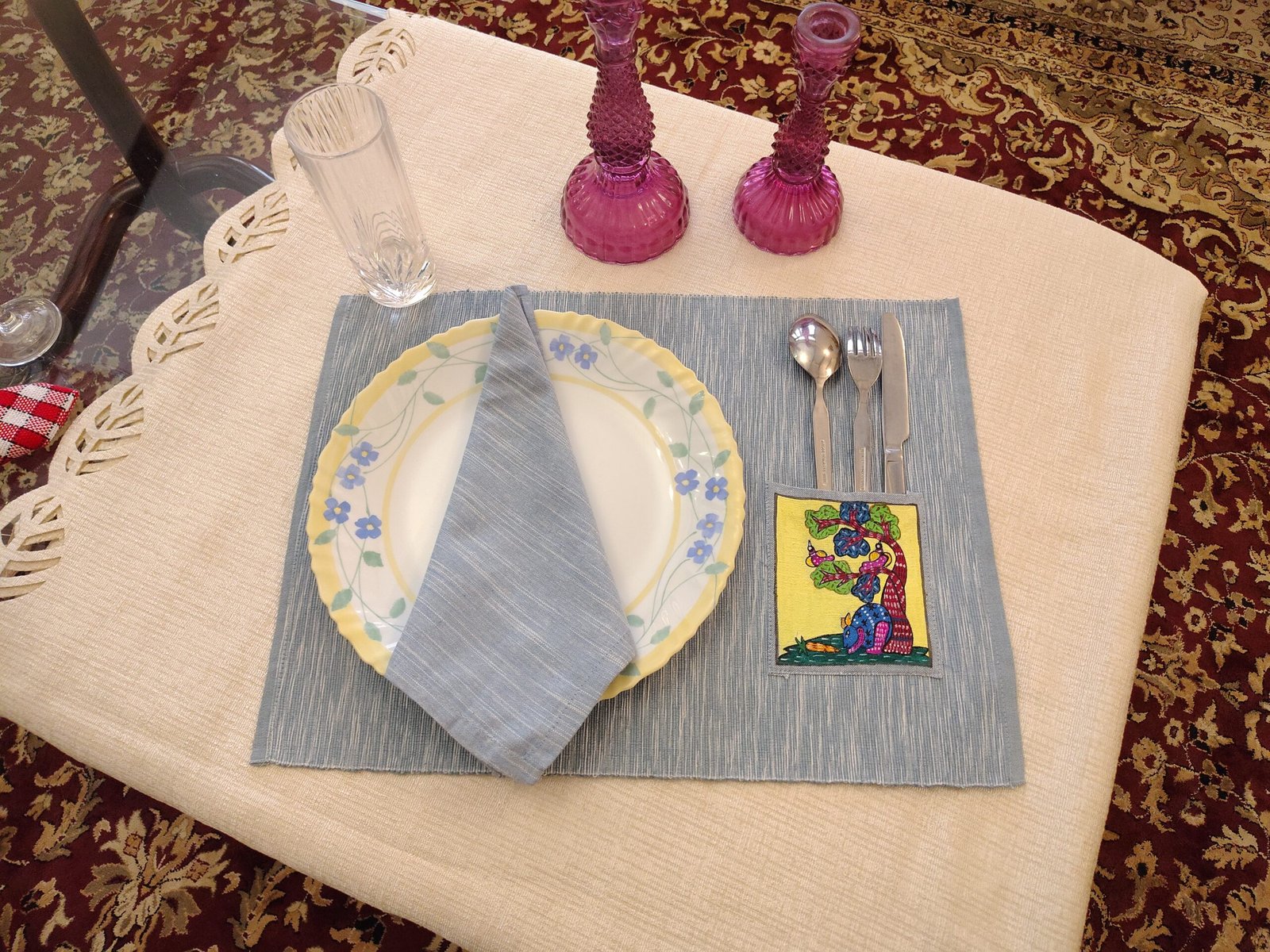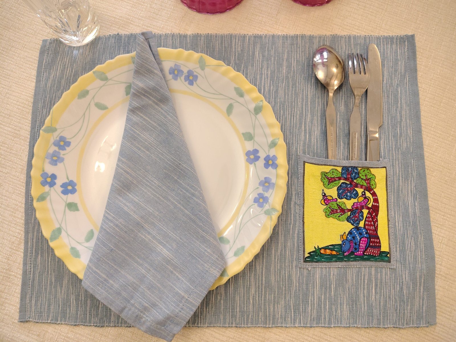 Hand Painted Dining Table Blue Mat & Napkin set Product DetailsSize: 13 * 18 Inch1 set contains 2 mats and 2 napkins.Front hand painted with fabric color.Fabric: Handloom cotton with zari Read more Read more
