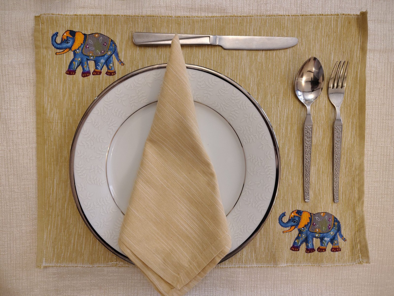 Hand Painted Dining Table yellow Mat & Napkin set Product DetailsSize: 13 * 18 Inch1 set contains 2 mats and 2 napkins.Front hand painted with fabric color.Fabric: Handloom cotton with zari Read more Read more